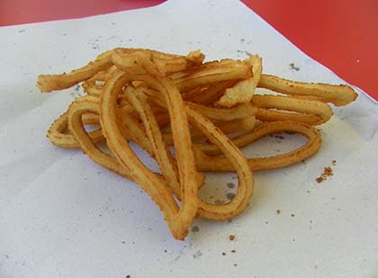 Los hacen de lazo, como los que se ponen ahora la gente que quiere reivindicar algo, pero estos lo que reivindican es el cucurruito, la filosofía que practican los buenos churros, casi etéreos por dentro y crujientes por fuera. Te los sirven en cartuchos, por lo que puedes optar por sentarte a tomarlos frente a la plaza o pasear por ella con los cucurruitos puestos.